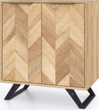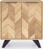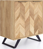 Embrace the fusion of elegance and functionality with our mini sideboard, a refined statement piece that redefines storage in style. Crafted from the exquisite Indian mango wood, this sideboard embodies both natural beauty and enduring quality. Its defining allure lies in the captivating parquet detailing on the door fronts, a testament to meticulous craftsmanship that adds a touch of sophistication to any room. Supported by sleek black steel legs, this mini sideboard marries modern aesthetics with sturdy construction. Behind the two doors lies a thoughtfully designed cabinet, complete with a central shelf, offering versatile storage to organize your essentials with ease. Ideal for smaller spaces or as an accent piece, this mini sideboard effortlessly combines form and function. Whether gracing your living room, bedroom, or hallway, it serves as both a visual delight and a practical storage solution. Experience the artful charm of Indian mango wood and the ingenuity of design with our mini sideboard, a compact yet impactful addition that elevates your space with its seamless blend of style and utility.