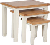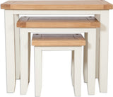 Crafted with natural oak tops and MDF/Pine painted bases, these tables exude timeless charm and durability. Featuring a substantial 38mm thick top adorned with a delightful raised peg detail, they offer both elegance and sturdiness. The tapered legs add a touch of sophistication, while the ingenious design allows for convenient nesting, saving valuable space when not in use. Whether used individually or together, these tables are perfect for serving snacks, displaying decor, or simply adding a touch of rustic elegance to your home.
