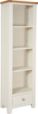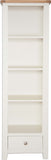 Crafted with a natural oak top and a durable MDF/Pine painted Ivory base, this bookcase exudes timeless elegance. The 28mm thick top with a raised peg detail adds a touch of sophistication, while the tapered legs provide stability and charm. With three adjustable shelves and a convenient drawer, it offers ample storage space for your books, decor, and more. Complete with a simple knob handle, this bookcase is a versatile addition to any room.