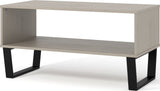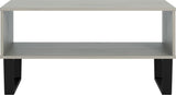 A great centre piece, this industrial look coffee table with undershelf storage combines solid wood in an grey wax finish with a substantial hardwearing black stove painted metal underframe.